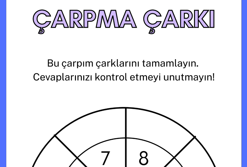 Çarpma Çarkı, öğrencilerin çarpım tablosunu eğlenceli ve etkileşimli bir şekilde öğrenmelerini sağlayan bir matematik etkinliğidir. Çarkın iç ve dış halkalarında yer alan sayılar eşleştirilerek çarpma işlemleri hızlıca yapılır. Öğrenciler çarkı döndürerek her seferinde yeni bir çarpma işlemiyle karşılaşır ve zihinden işlem yapma becerilerini geliştirir. Bu etkinlik; dikkat, hız ve matematiksel düşünme becerilerini destekler.
