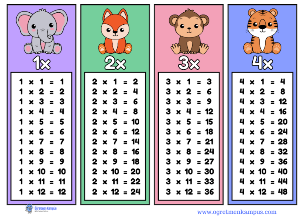Renkli çarpım tablosu. Deftere yapıştırarak kullanılabilir.