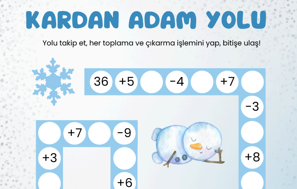 Bu etkinlikte öğrenciler, verilen yolu takip ederek her adımda yer alan toplama ve çıkarma işlemlerini çözer. Doğru işlemleri yapan öğrenciler kardan adam yolunda ilerleyerek bitişe ulaşır. Etkinlik; öğrencilerin temel matematik becerilerini, dikkatlerini ve işlem hızlarını geliştirmeyi amaçlar. Eğlenceli görsellerle matematiği keyifli hâle getirir.