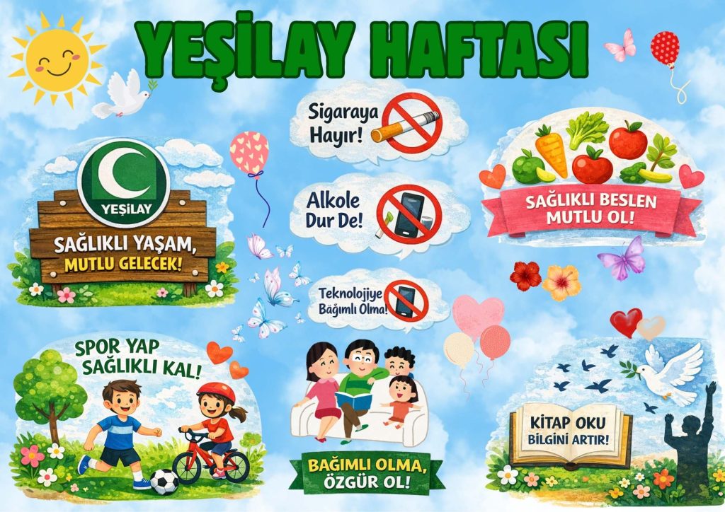 1-7 Mart Yeşilay Haftası kapsamında hazırlanan bu pano çalışması, öğrencilerde bağımlılıkla mücadele bilinci oluşturmak ve sağlıklı yaşam farkındalığını artırmak amacıyla hazırlanmıştır.